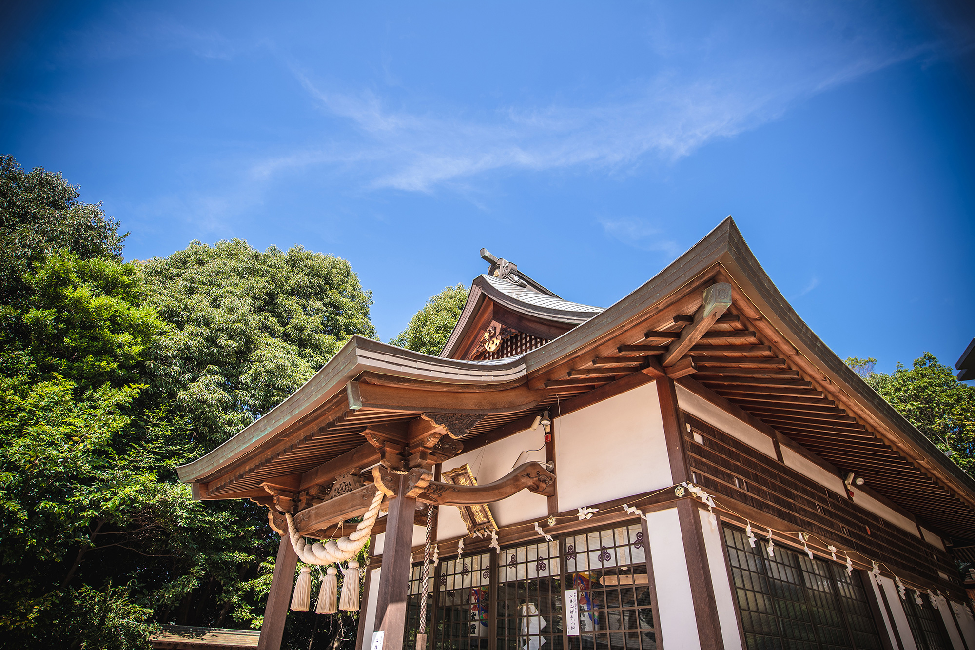 《御祭神・ 品陀和気命、息長帯日売命、帯仲彦命》社伝によれば、推古天皇御宇(593-628)宮島の厳島神社とほぼ同じくして、この入江の奥に多紀理姫命を海路の守護神として祭ったのが当神社の創祀。八幡神の奉斎の時期については、諸説が社伝として残り定かではありませんが、鎌倉時代に武蔵国渋谷郷(現、東京都渋谷区)から当地に所領を得て来住した社家始祖(右衛門大夫または右京大夫と伝える)が宇佐八幡宮より勧請し、古くより当地に祀られていた「多紀理の宮」と合祀して八幡宮を創建し、後に力箭八幡宮と称したと言われています。その後、大永四年(1524)に修造。昭和六年、近郷六箇村の氏子により境内地の造成と共に総ての社殿が再建造営されました。相殿神の宗像三女神の内、市寸島姫命と湍津姫命は明治二十五年厳島神社より御分霊を神馬にお乗せして正式に勧請され、素盞嗚神、倉稲魂神、金刀比羅神は明治末期神社統廃合の折、合祀されたものです。再建の度に高所へ遷され、現在では力箭山の中腹に鎮座しています。